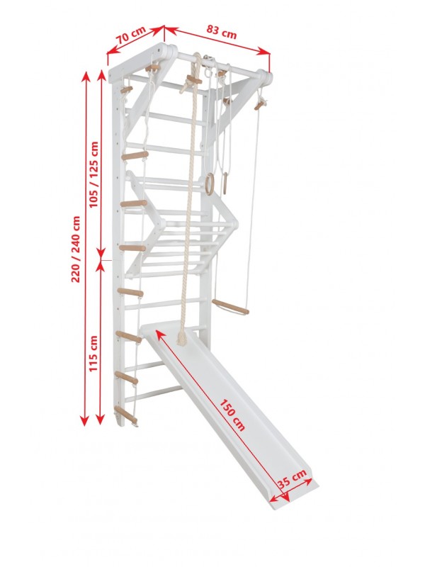 - Load Capacity: Climbing wall up to 150 kg | Upper bar up to 100 kg | Children’s triangle bar up to 50 kg | Hanging elements on ropes up to 60 kg
