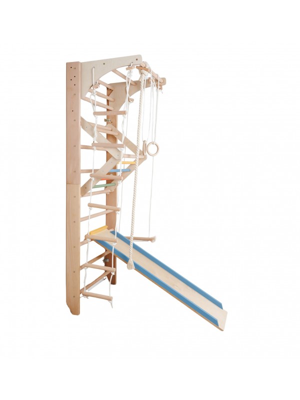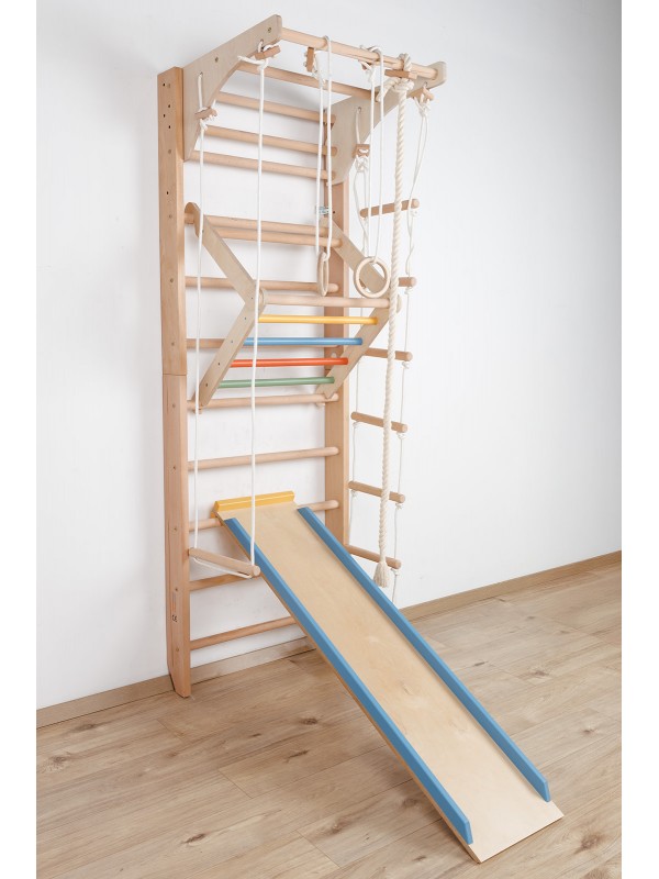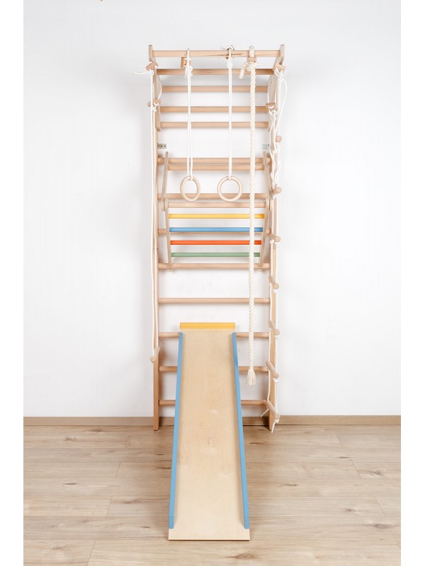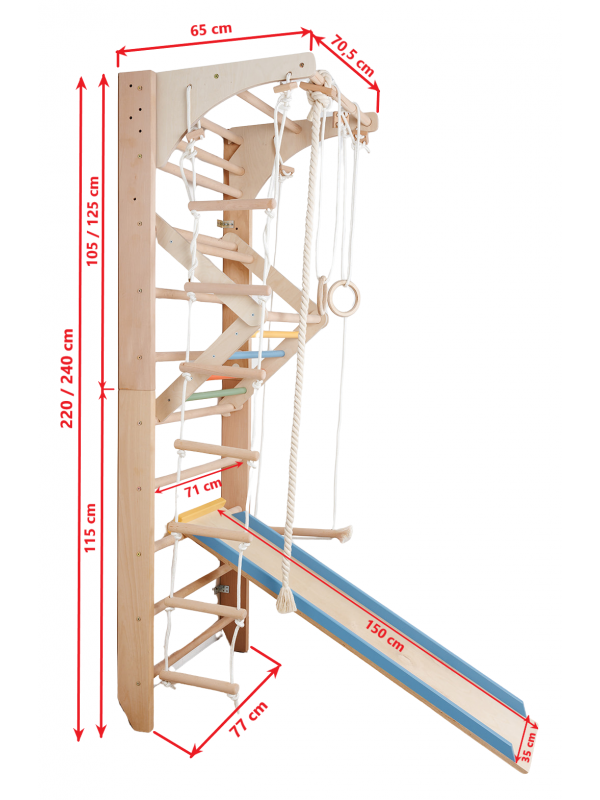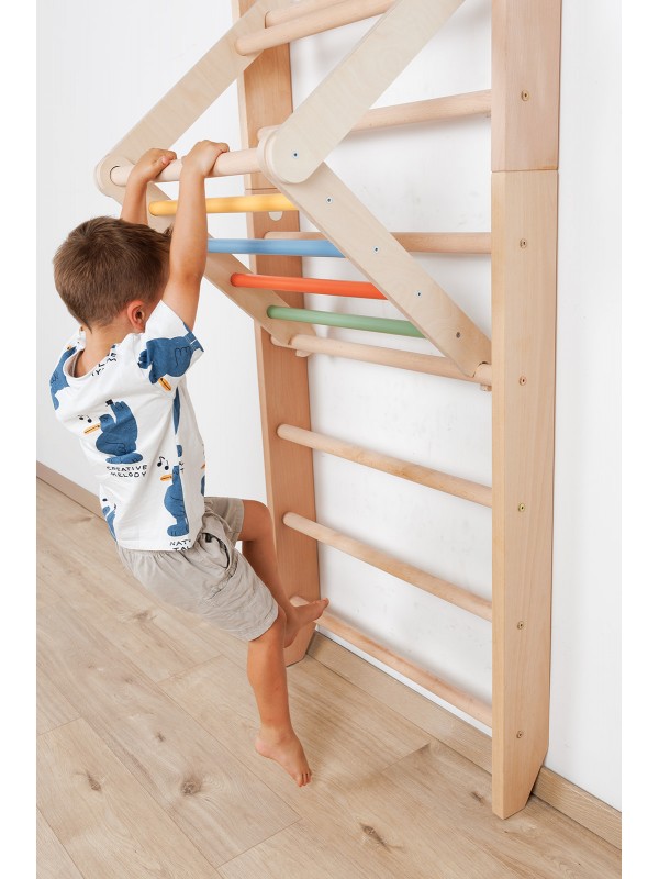 Wall bars with accessories combine the functionality of a classic climbing ladder with a fun climbing wall. They allow the development of movement, strength, balance, and coordination, offering endless possibilities for play and exercise indoors.